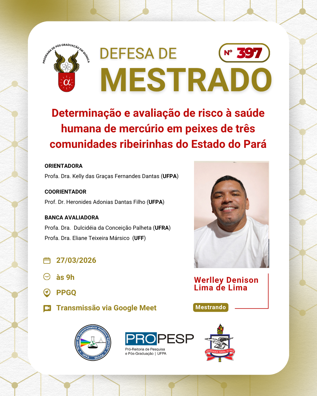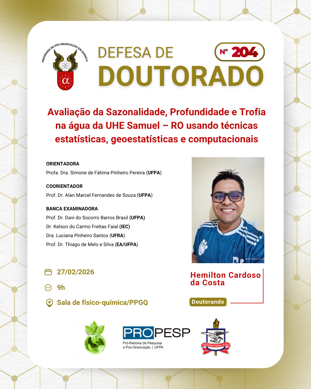 O Programa de Pós - Graduação em Química da UFPA convida à comunidade acadêmica para prestigiar a Defesa da Tese de Doutorado do discente Hemilton Cardoso da Costa. A seguir tem-se as informações do procedimento: