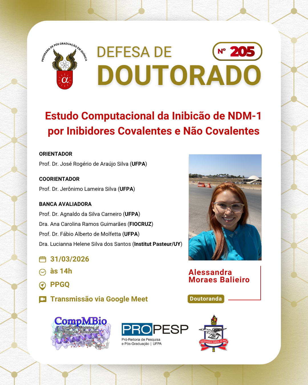 O Programa de Pós - Graduação em Química da UFPA convida à comunidade de modo geral para prestigiar a defesa de doutorado do discente Matheus Arrais Gonçalves. A seguir tem-se as informações do procedimento: