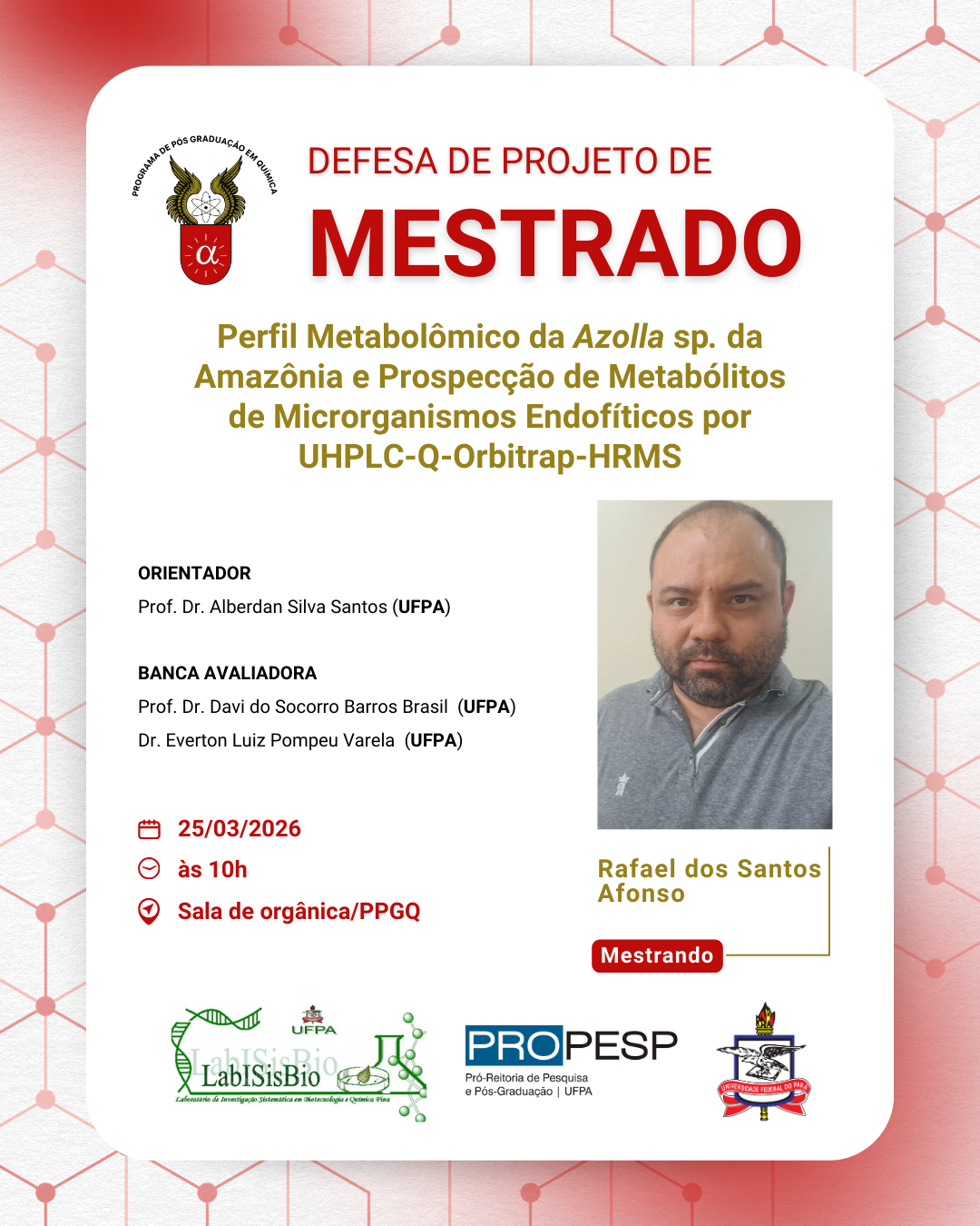 O Programa de Pós - Graduação em Química da UFPA convida à comunidade acadêmica para prestigiar a Defesa de Projeto de Pesquisa Mestrado I do discente Rafael dos Santos Afonso. A seguir tem-se as informações do procedimento:
