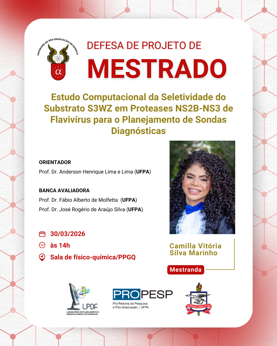 O Programa de Pós - Graduação em Química da UFPA convida à comunidade acadêmica para prestigiar a Defesa de Projeto de Pesquisa Mestrado I da discente Camilla Vitória Silva Marinho. A seguir tem-se as informações do procedimento: