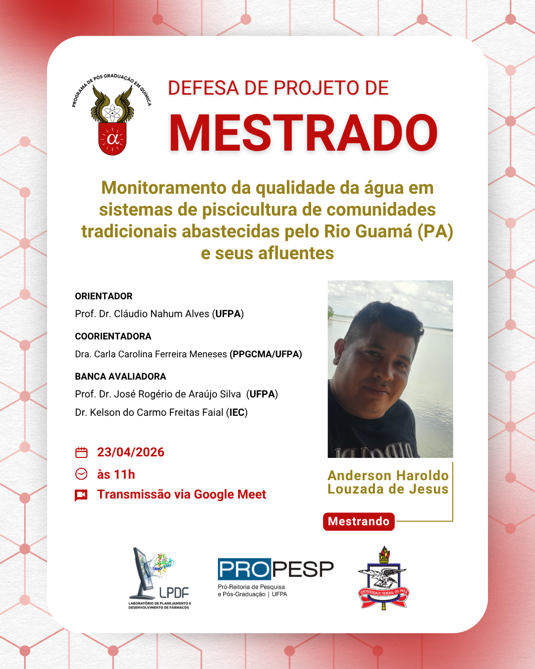 O Programa de Pós - Graduação em Química da UFPA convida à comunidade acadêmica para prestigiar a Defesa de Projeto de Pesquisa Mestrado I do discente Anderson Haroldo Louzada de Jesus. A seguir tem-se as informações do procedimento: