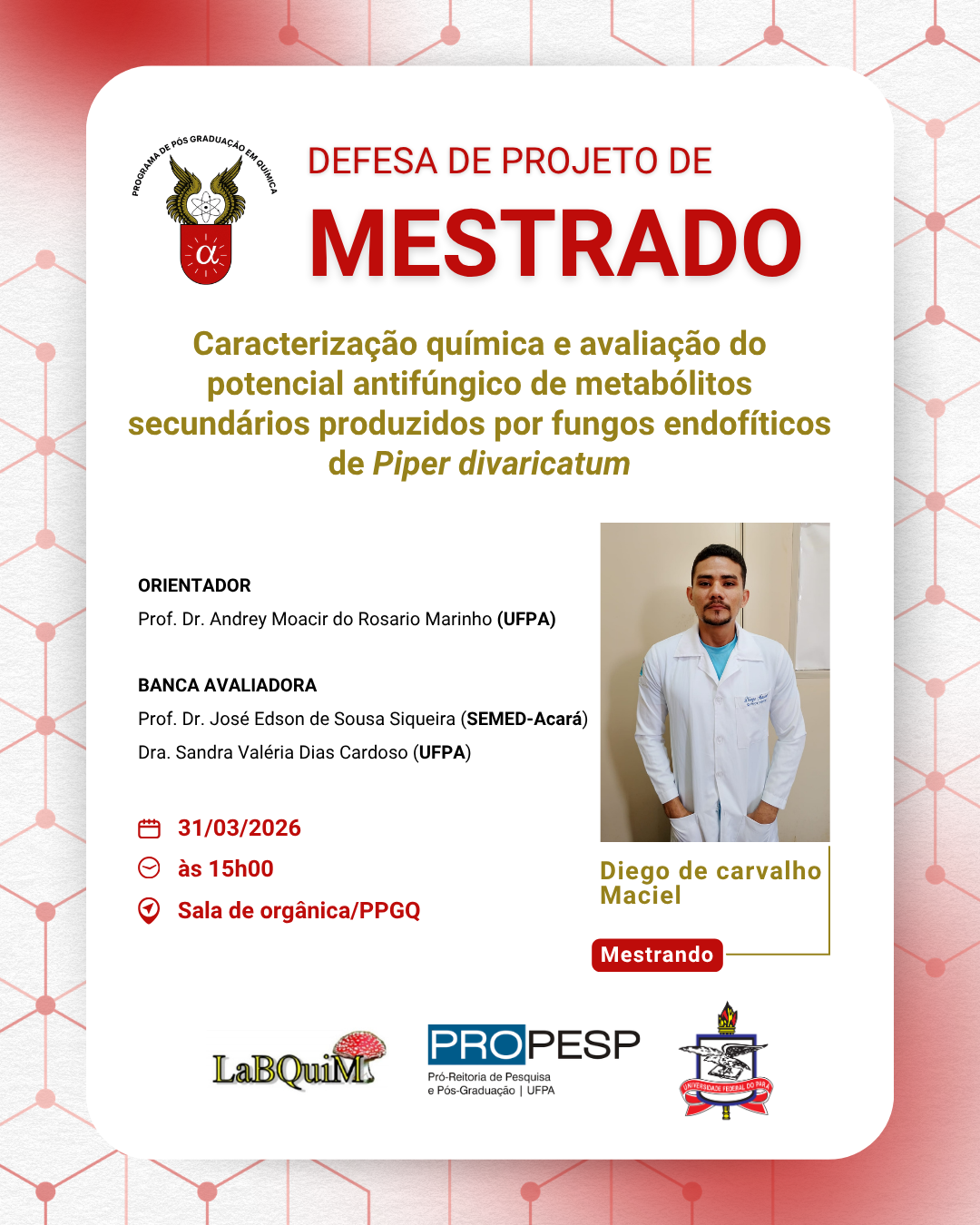 O Programa de Pós - Graduação em Química da UFPA convida à comunidade acadêmica para prestigiar a Defesa de Projeto de Pesquisa Mestrado I do discente Diego de Carvalho Maciel. A seguir tem-se as informações do procedimento: