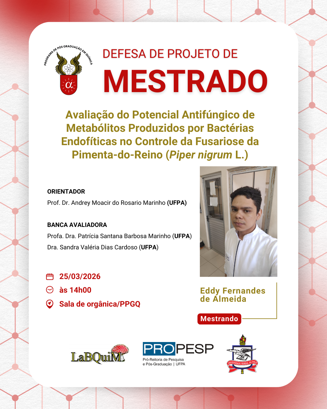 O Programa de Pós - Graduação em Química da UFPA convida à comunidade acadêmica para prestigiar a Defesa de Projeto de Pesquisa Mestrado I do discente Eddy Fernandes de Almeida. A seguir tem-se as informações do procedimento: