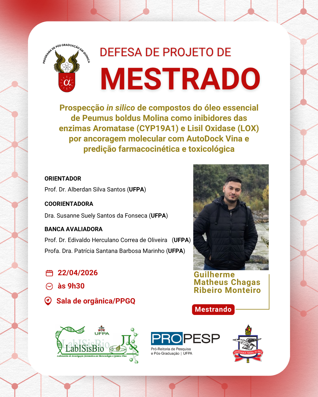 O Programa de Pós - Graduação em Química da UFPA convida à comunidade acadêmica para prestigiar a Defesa de Projeto de Pesquisa Mestrado I do discente Guilherme Matheus Chagas Ribeiro Monteiro. A seguir tem-se as informações do procedimento: