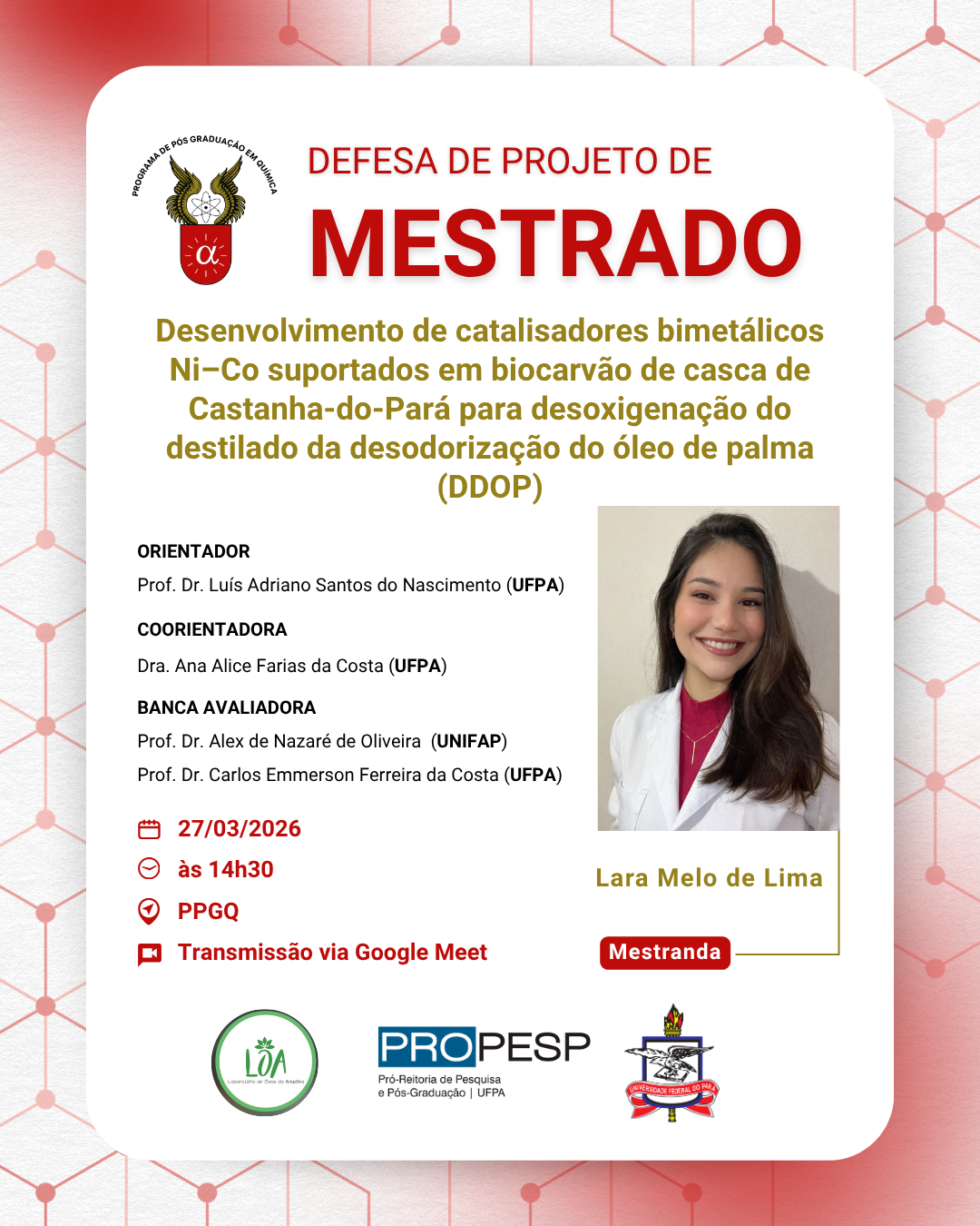 O Programa de Pós - Graduação em Química da UFPA convida à comunidade acadêmica para prestigiar a Defesa de Projeto de Pesquisa Mestrado I da discente Lara Melo de Lima. A seguir tem-se as informações do procedimento: