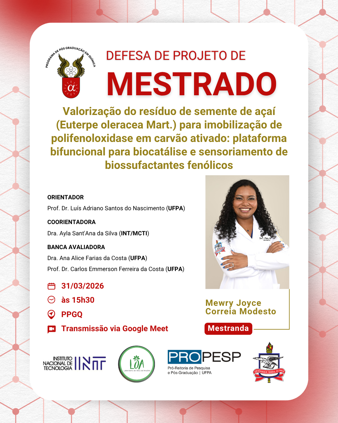 O Programa de Pós - Graduação em Química da UFPA convida à comunidade acadêmica para prestigiar a Defesa de Projeto de Pesquisa Mestrado I da discente Mewry Joyce Correia Modesto. A seguir tem-se as informações do procedimento: