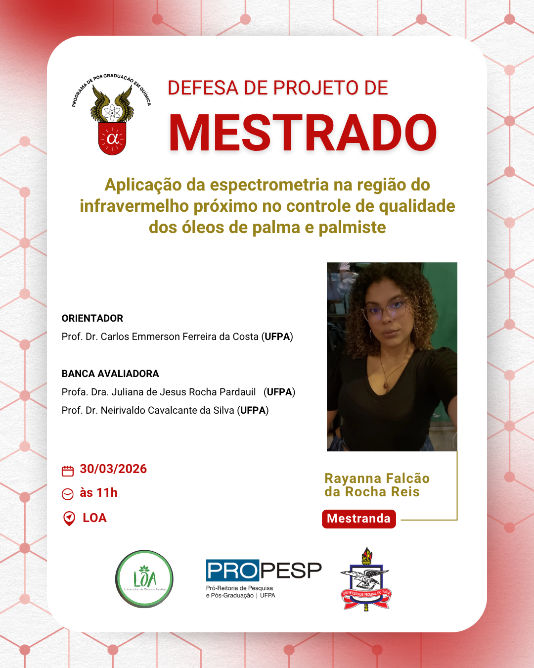 O Programa de Pós - Graduação em Química da UFPA convida à comunidade acadêmica para prestigiar a Defesa de Projeto de Pesquisa Mestrado I da discente Rayanna Falcão da Rocha Reis. A seguir tem-se as informações do procedimento:
