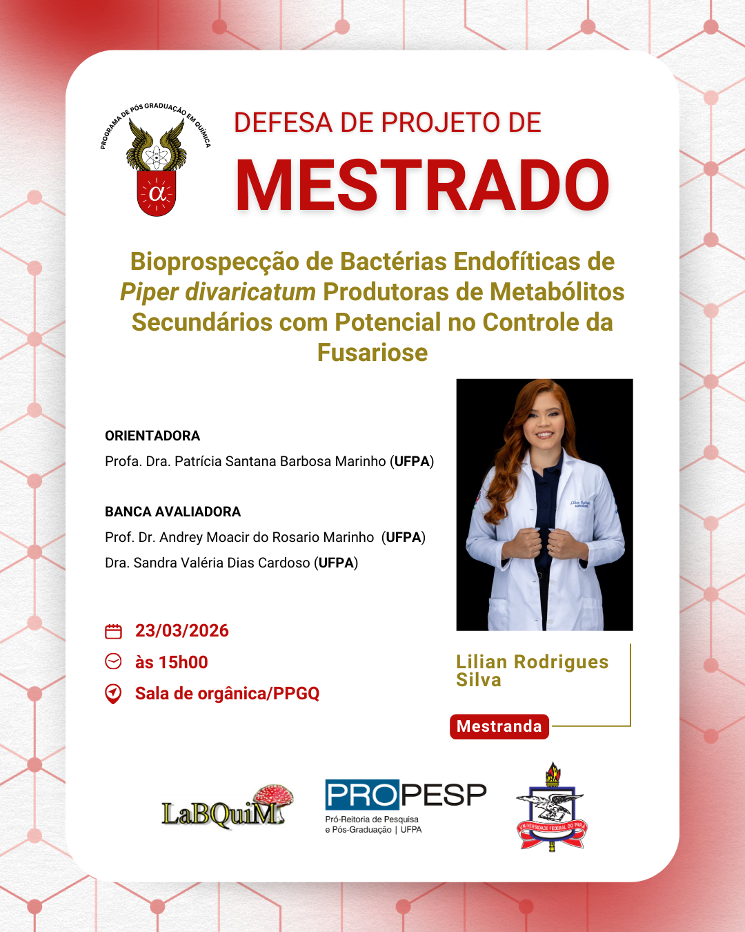 O Programa de Pós - Graduação em Química da UFPA convida à comunidade acadêmica para prestigiar a Defesa de Projeto de Pesquisa Mestrado I da discente Lilian Rodrigues Silva. A seguir tem-se as informações do procedimento: