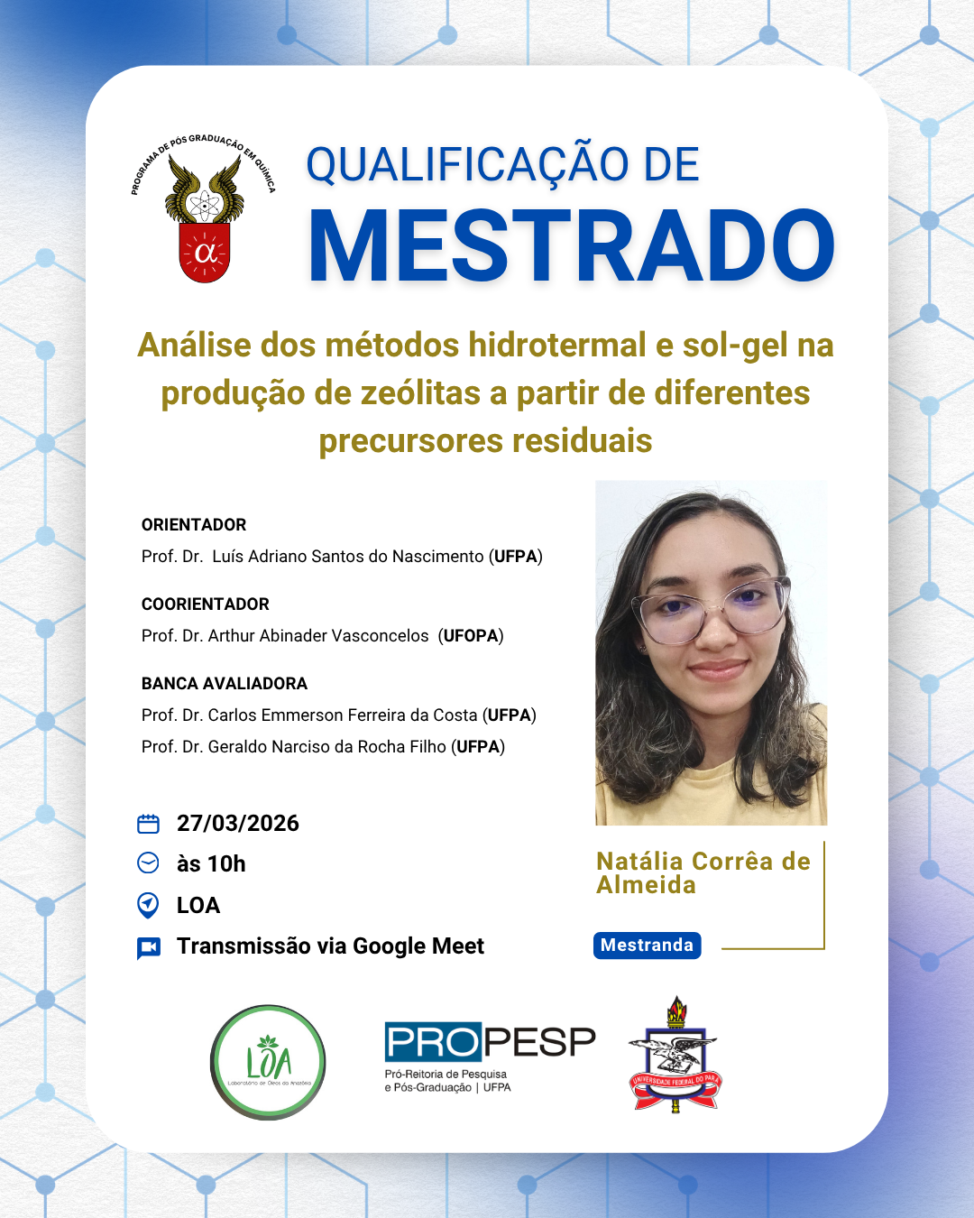 O Programa de Pós - Graduação em Química da UFPA informa a comunidade acadêmica sobre o Exame de Qualificação de Mestrado da discente Natália Corrêa de Almeida. A seguir tem-se as informações do procedimento: